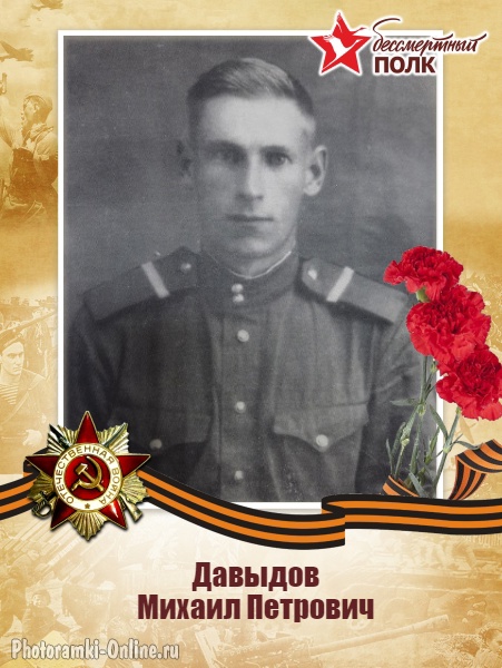 Мой прадедушка, Давыдов Михаил Петрович, родился 4 декабря 1923 года в селе Тростянка Балашовского района Саратовской области. Он отучился всего 8 классов, потому что его отец был железнодорожником, и семья постоянно меняла своё место жительства. После школы работал шофёром, а с началом войны в 19 лет, его призвали в войска.