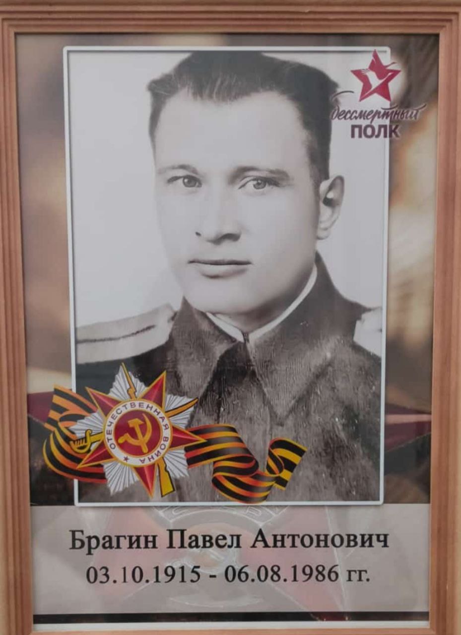 Брагин П.А. был на фронте Отечественной войны с 24 декабря 1941 г. по 11 июня 1942 г. 27 ноября 1941 г. был тяжело ранен в левую руку и в бедро правой ноги. В момент ранения выполнял должность ком. стр. взвода 1245 стр. полка, 375 стр. дивизии, 27 армии Калининского фронта. 11 июня 1942 г. был тяжело ранет в левую руку, в момент ранения выполнял должность ком. стр. взвода 389 стр. полка Ленинградского фронта. В следствии ранения ограниченное движение левой руки и ампутированы три пальца. После ранения стал инвалидом третей группы. В плену не был.